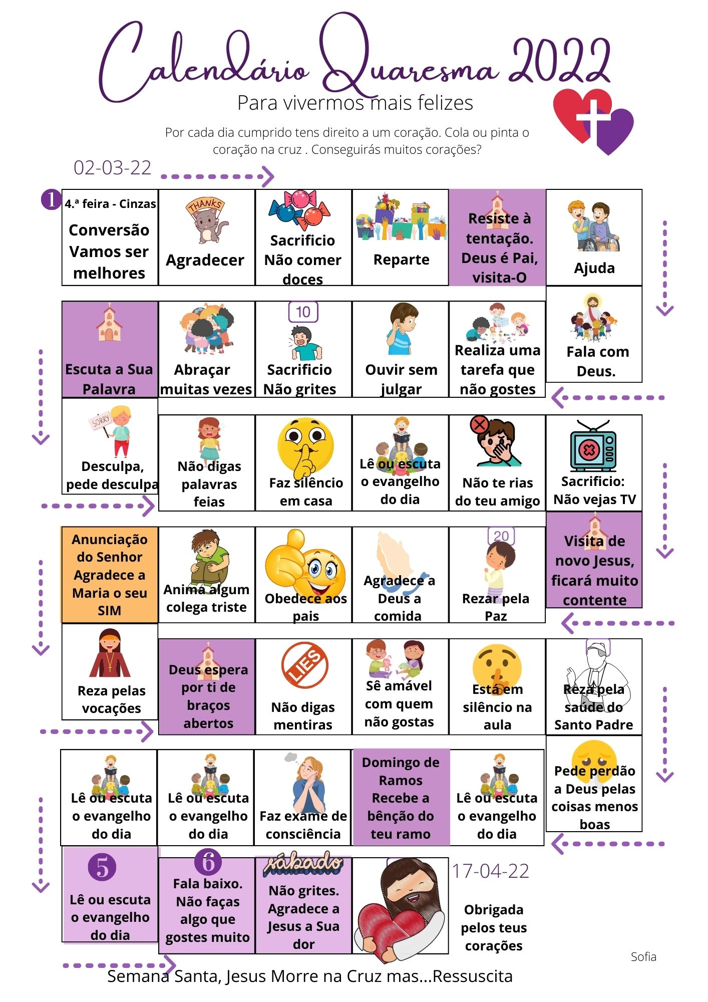 A catequese do 1º ano, elaborou o calendário “Quaresma de 2022” para ajudar os meninos a viver a Quaresma.